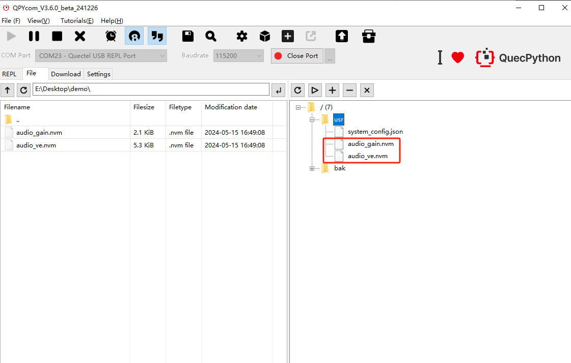 使用QPYCom工具,连接模组之后,打开调试端口,将NV文件放入usr目录下,重启模组即可生效。目前仅EC600M系列、EC800M系列、EC600N系列、EG810M系列支持该方法,其他型号模组请联系移远技术支持。