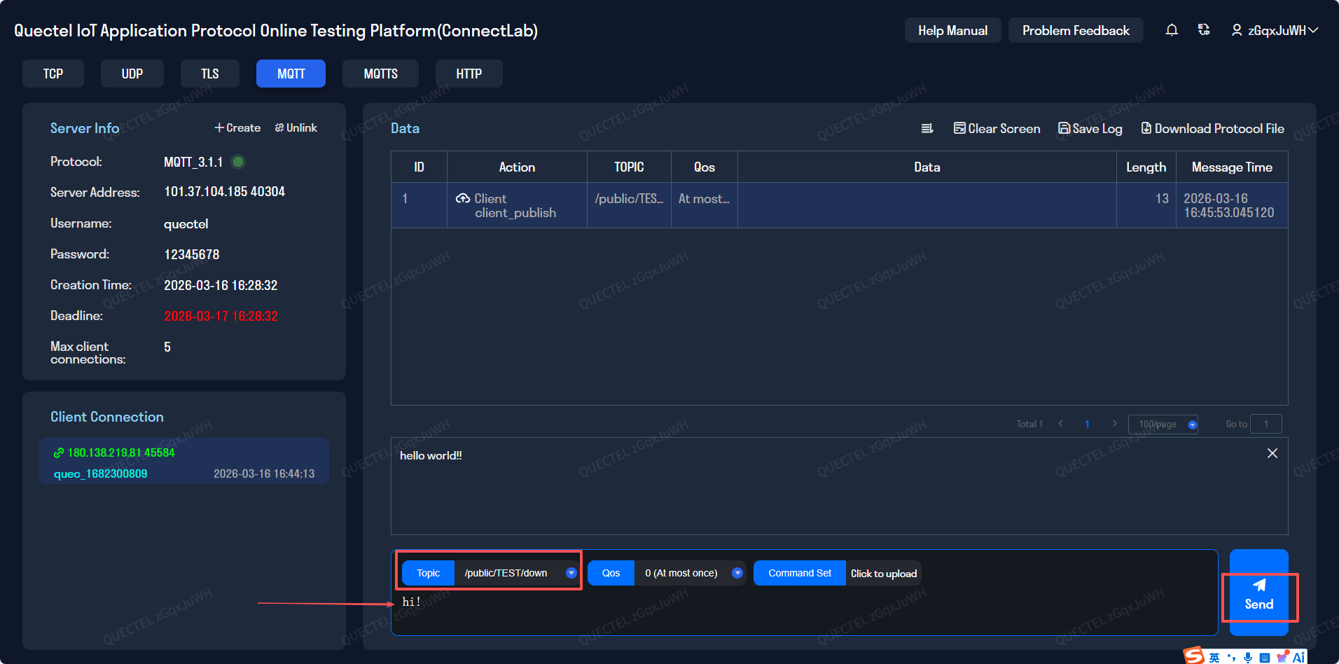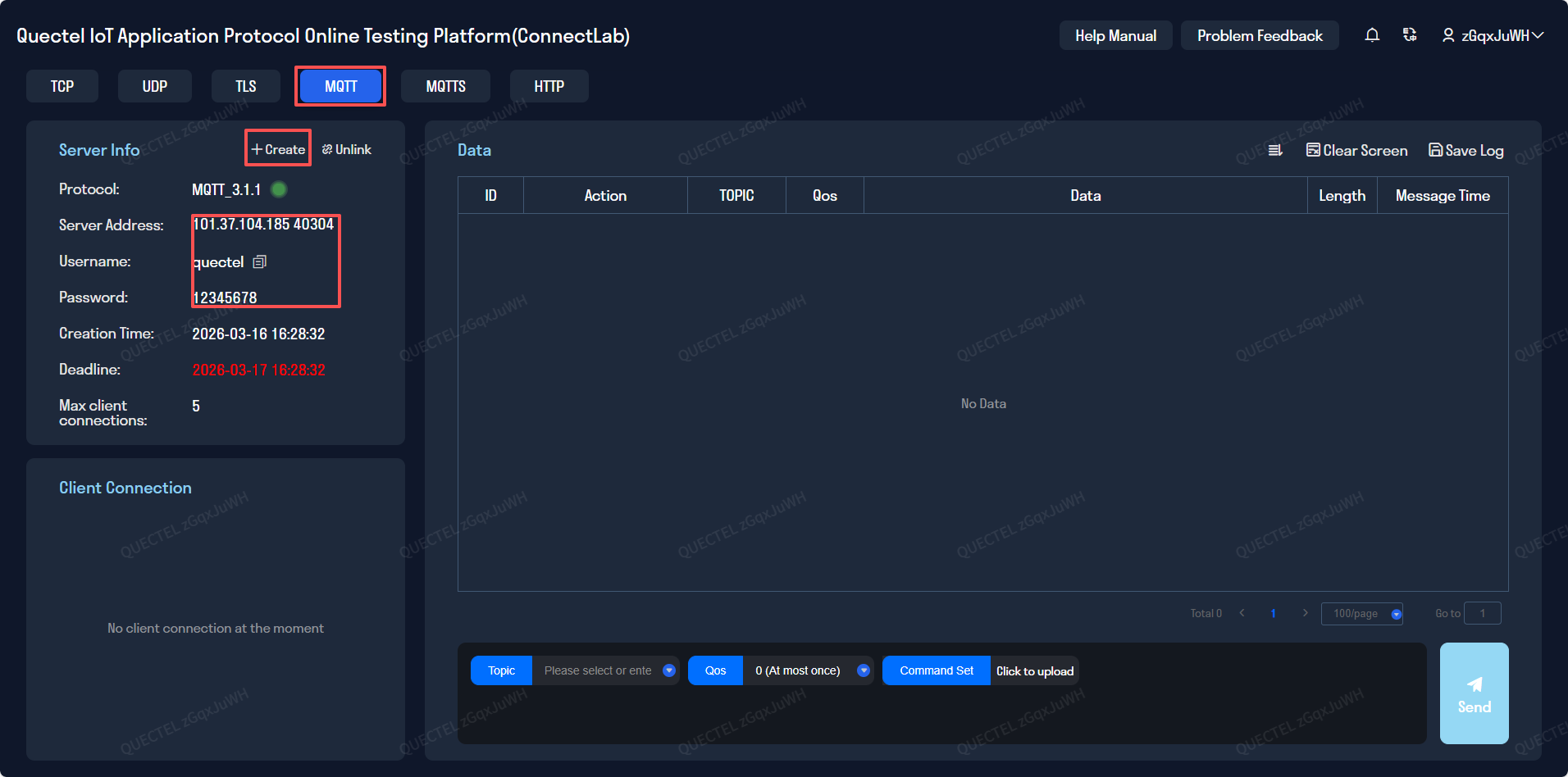 mqtt_private_cloud_config配置项中的 MQTT 服务器域名(server)、端口(port)、客户端id(client_id)以及订阅和发布主题等参数,如下。当前使用了移远推出的ConnectLab 物联网应用协议测试平台来进行的。{ "mqtt_private_cloud_config": { "server": "101.37.104.185", "port": 40304, "client_id": "quec_1682300809", "user": "quectel", "password": "12345678", "clean_session": true, "qos": 0, "keepalive": 60, "subscribe": {"down": "/public/TEST/down"}, # 下行数据透传主题 "publish": {"up": "/public/TEST/up"} # 上行数据透传主题 } }uart_config配置项是串口配置参数,默认是根据当前实验开发板做的配置,不可更改。如用户采用其他开发板则需要根据实际硬件进行配置。{ "uart_config": { "port": 2, # 串口号,根据实际硬件配置选择,当前实验不可更改 "baudrate": 115200, # 波特率 "bytesize": 8, # 数据位 "parity": 0, # 奇偶校验 "stopbits": 1, # 停止位 "flowctl": 0, # 流控 "rs485_config": { # RS485 配置 "gpio_num": 28, # 485 控制脚,当前实验不可更改 "direction": 0 # 引脚电平变化控制,1表示引脚电平变化为:串口发送数据之前由低拉高、发送数据之后再由高拉低,0表示引脚电平变化为:串口发送数据之前由高拉低、发送数据之后再由低拉高 } } }network_config用于配置APN,如果没有配置APN或者配置了错误的APN,运营商的基站会在注网过程中自动纠正并下发一个正确的APN给终端,海外用户需配置此项,此时终端会选择接受并使用该APN继续入网。{ "apn": "", # 接入点名称,例如 "cmnet" 或 "ctnet" "username": "", # APN用户名,一般不需要 "password": "", # APN密码 "auth_type": 0 # 认证类型:0-无认证,1-PAP,2-CHAP }
