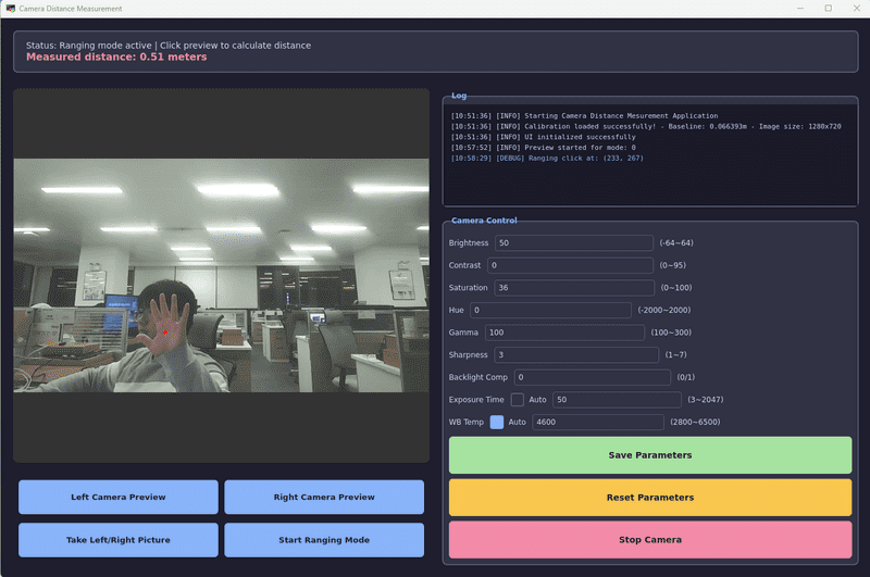 This project uses a stereo camera to simultaneously capture left and right images, calculates target distance using the stereo disparity principle, and provides auxiliary functions such as camera calibration and parameter adjustment. It can serve as a reference example for stereo ranging, stereo vision, and robot visual navigation applications.