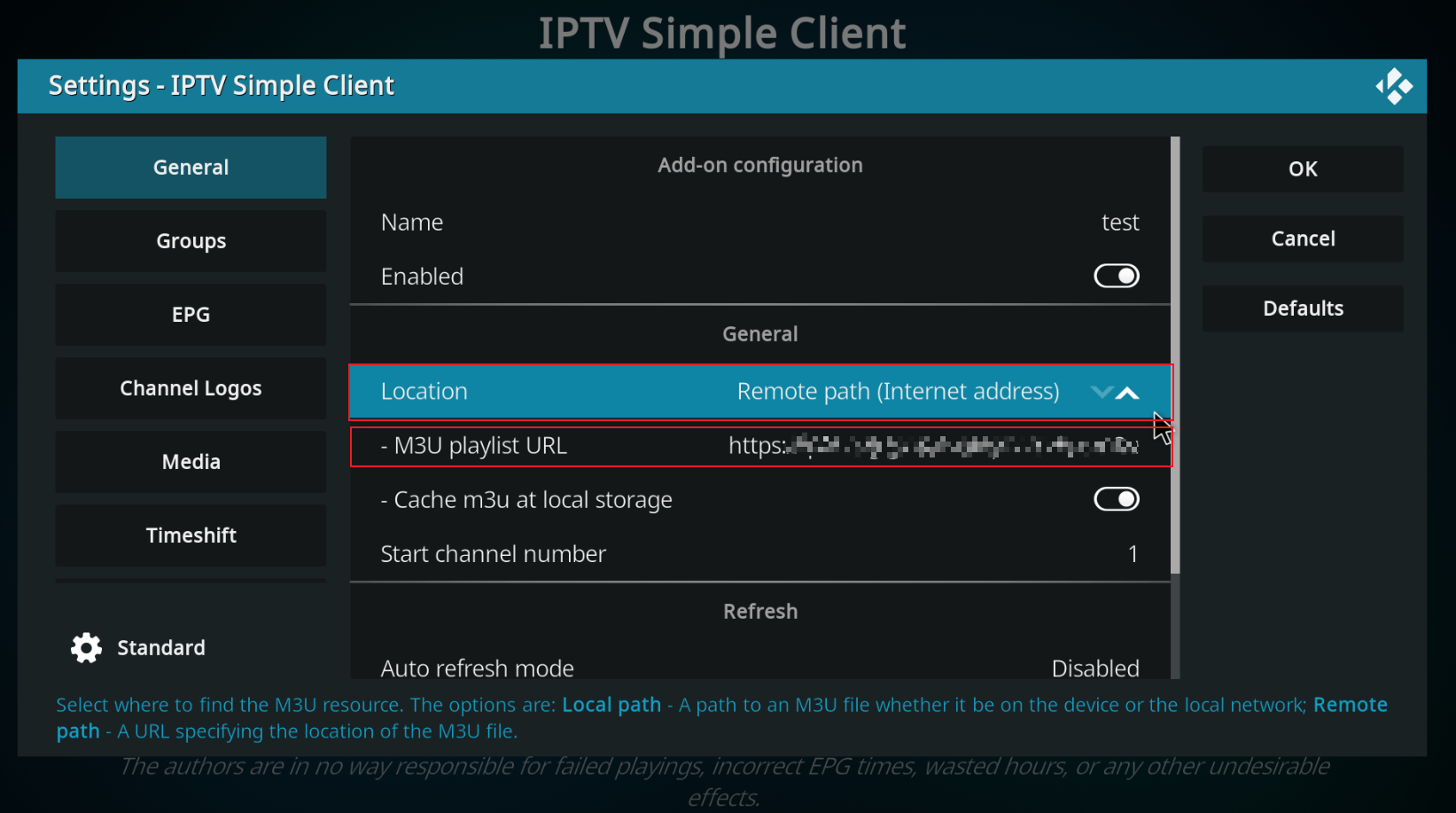 The location defaults to remote path. You can switch to local path by clicking the up/down toggle on the right. Select the live source file directory in the M3U playlist path. (Live source files are generally M3U8, which can be searched online, downloaded and stored locally, or accessed via URL remote path.) Here we choose to load the live source via remote path. Enter the remote URL into the "M3U playlist URL bar", click OK, Enable, then press ESC to return to the navigation interface.