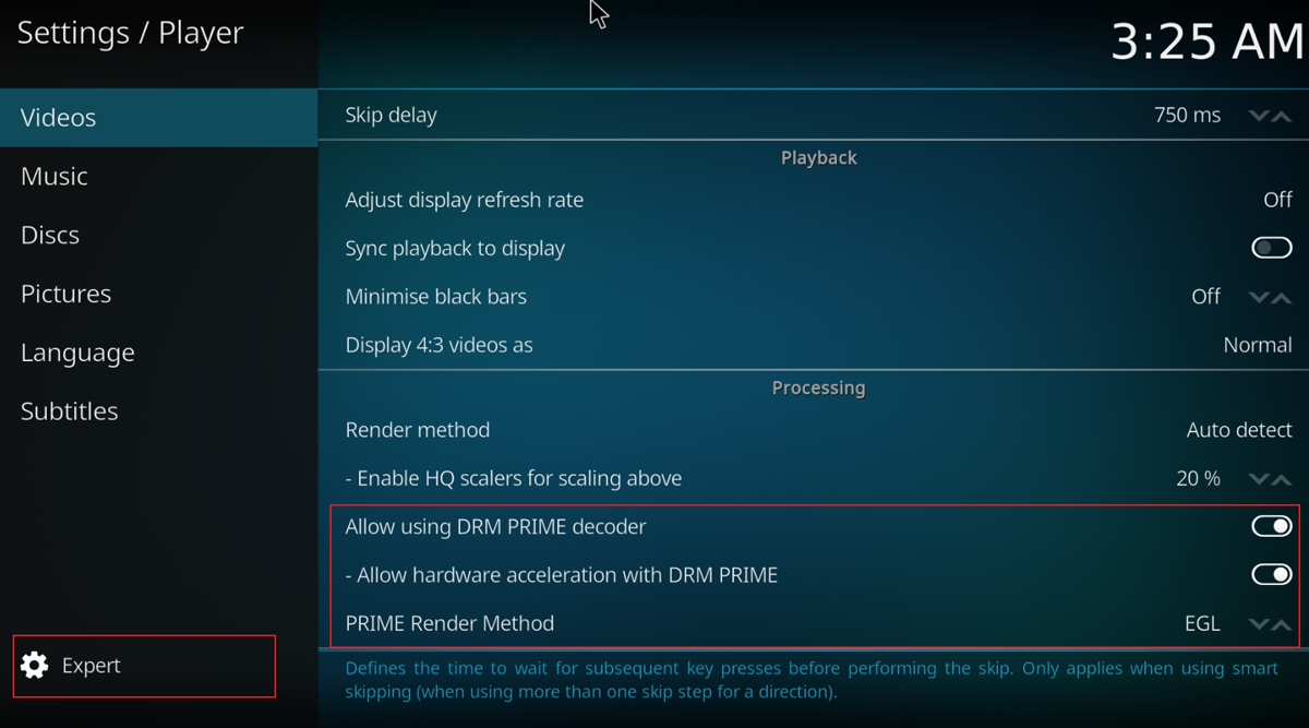 - Go to Settings->Player, click the gear to switch to Expert mode, allow DRM PRIME decoder and select EGL rendering.