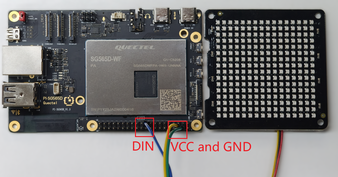 The 16×16 WS2812 RGB LED matrix display is connected to the Quectel Pi H1 single-board computer via the SPI interface. Connect the WS2812 data input to the corresponding interface pin on the Quectel Pi H1.