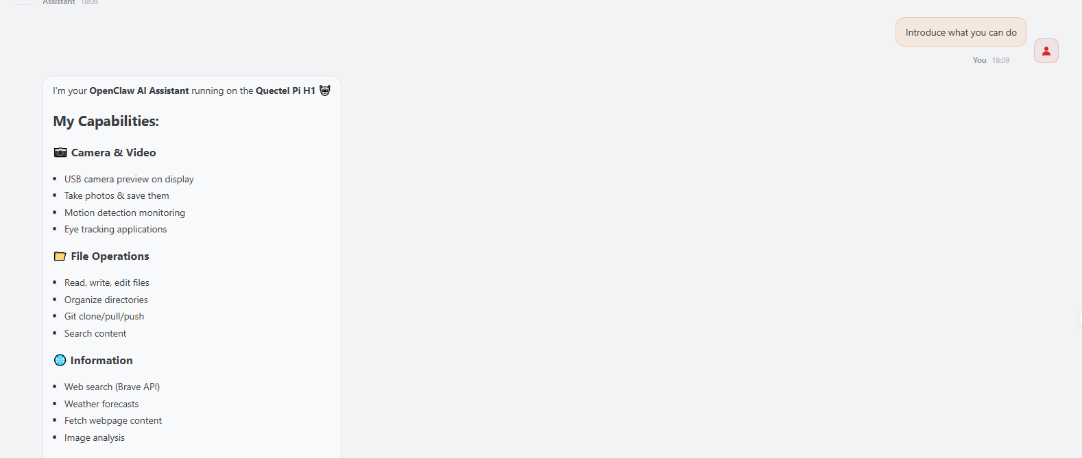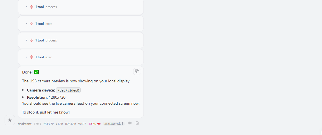 Send conversation instructions through the OpenClaw Web control page, and after a short wait, the real-time preview screen of the USB camera can be seen on the external display.