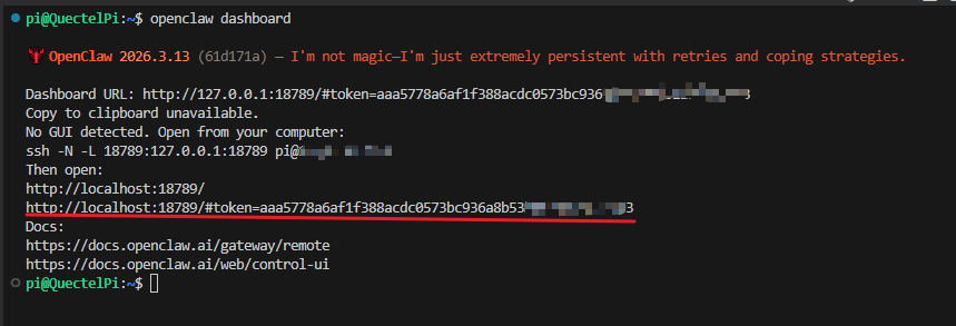 Execute the openclaw dashboard command in the terminal to view the access address of the OpenClaw Web management page.