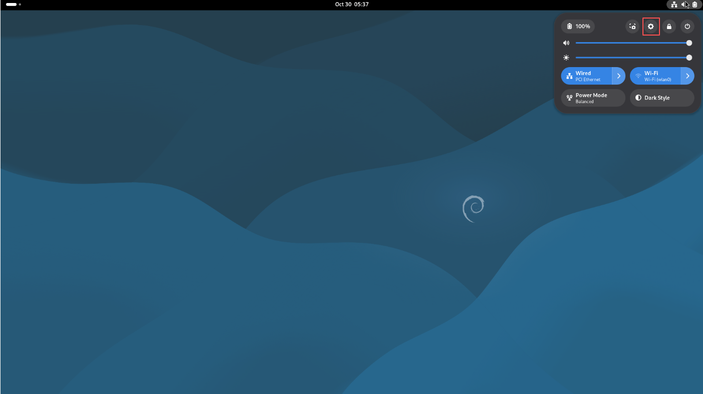 - Click on the gnome status bar in the upper right corner of the desktop, and click on Settings
