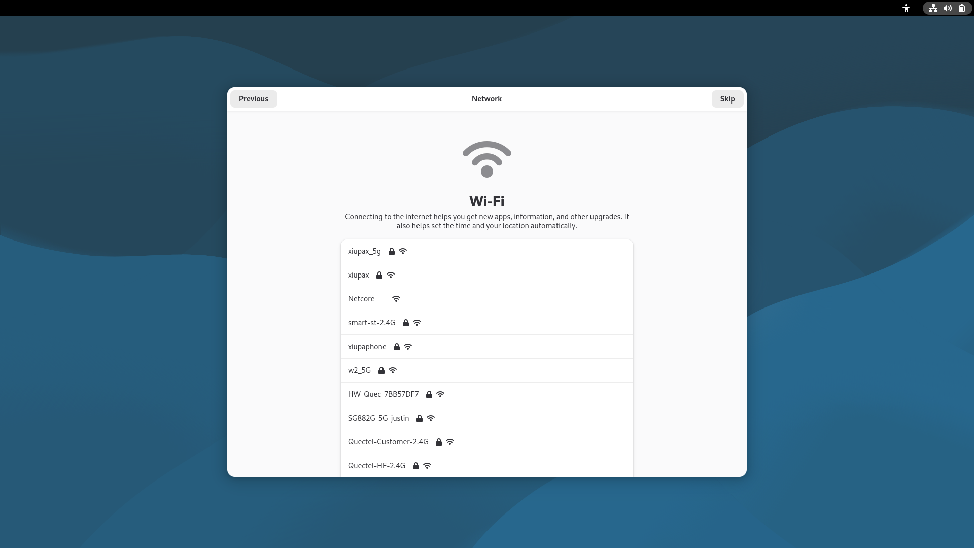 - Select WIFI connection. If not connected temporarily, click on the top right corner to skip