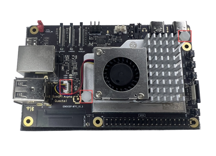 First, insert the heatsink cable into the FAN slot of the single-board computer, and then fix the two ends of the heatsink into the reserved holes of the single-board computer.