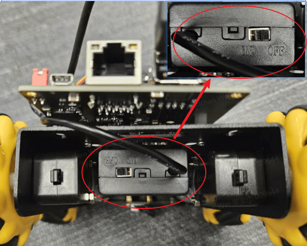 - Install two charged 18650 batteries in the battery box at the bottom of the car according to the positive and negative poles, then turn the bottom switch to "ON".