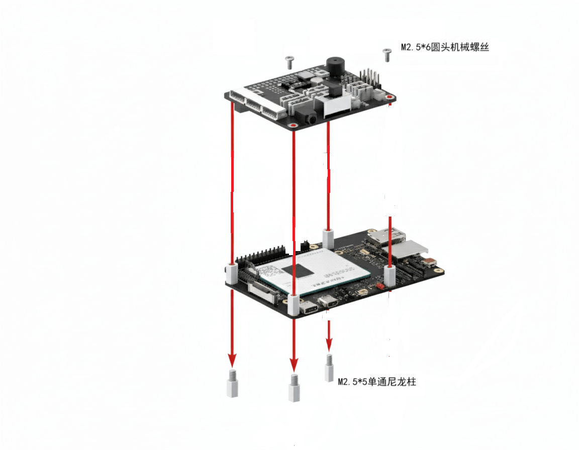 Use 3 M2.5*5 single-pass nylon pillars and 3 M2.5*10 double-pass nylon pillars to fix the main board. Align the female headers of the expansion board with the male headers of the main board (one-to-one alignment) and insert them into the main board. Then use 2 M2.5*6 round head machine screws to fix the expansion board and main board together.