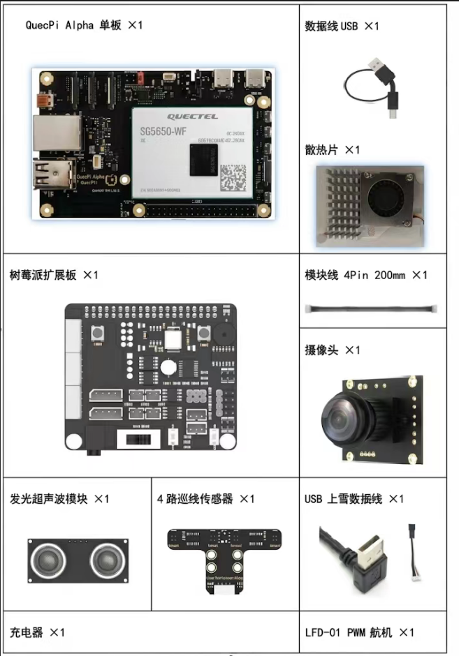 - 套件包含型材/电子/螺丝等结构件、18650 电池盒、主控与扩展板、云台摄像头、工具配件等,详见下方实物参考。