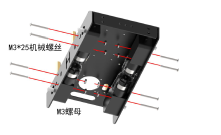 用8 颗M3*25 机械螺丝和8 颗M3 螺母,将四个TT马达固定在底盘上。