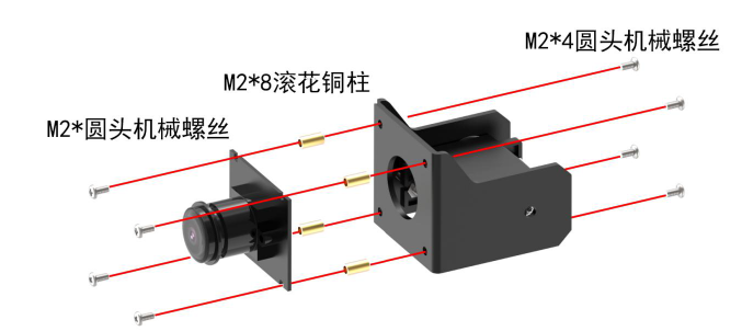 用4 颗M2*4 圆头机械螺丝和4 根M2*8 滚花铜柱固定在云台摄像头支架上。然后用2 颗M2*4 圆头机械螺丝将摄像头固定在云台摄像头支架上。