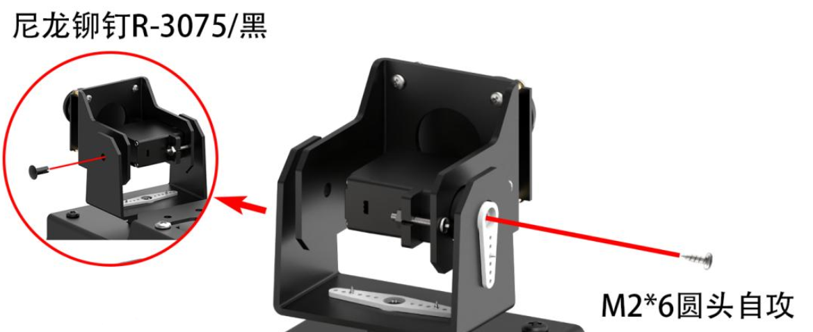 用2 颗M2*4 圆头自攻螺丝把塑料轴固定在云台U 型支架上,接着用1 颗M2*4圆头自攻螺丝把组装好的云台U 型支架安装在小车上。