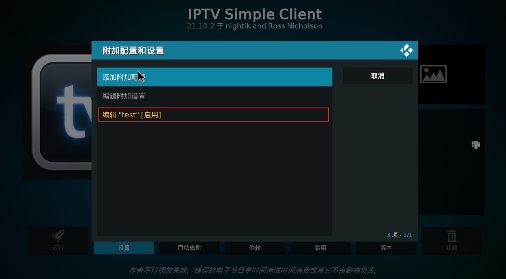 我们在终端安装时就已经通过命令安装过IPTV Simple Client,所以我们点击设置→插件→我的插件→PVR 客户端就可以看得到IPTV Simple Client,点击进入设置。