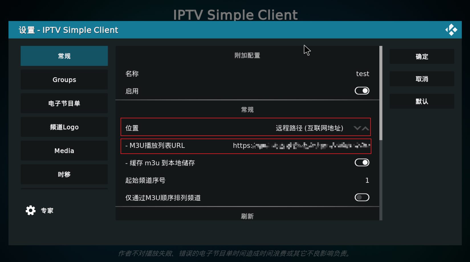 位置默认是远程路径,可以通过点右边上下切换标志切换到本地路径,在M3U播放列表路径中选择直播源文件目录(直播源文件一般为M3U8,可在网上搜索下载存放到本地或者通过URL远程路径访问)。这里选择远程路径加载直播源,将远程URL输入 "M3U播放列表URL栏" 即可,点击确定后启用该配置,按下ESC回退到导航界面。