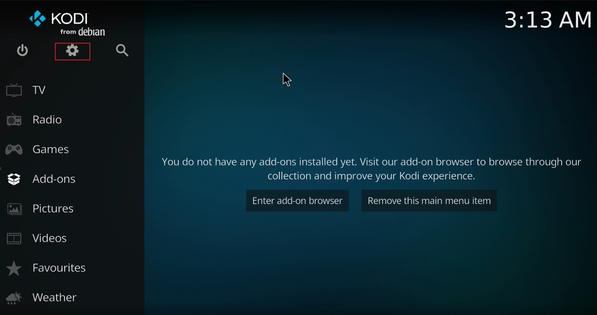 进入kodi后,会让我们选择是否让安装的插件生效,这时我们可以选择NO,后面再进行设置。然后会出现Enter add-on browser和Remove this main menu item的选项,我们直接点击左上方的齿轮进入设置。