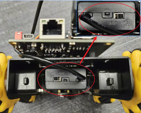 - 将两节有电的18650电池按照正负极对应装到小车底部的电池盒中,之后将底部的开关拨至“ON”。