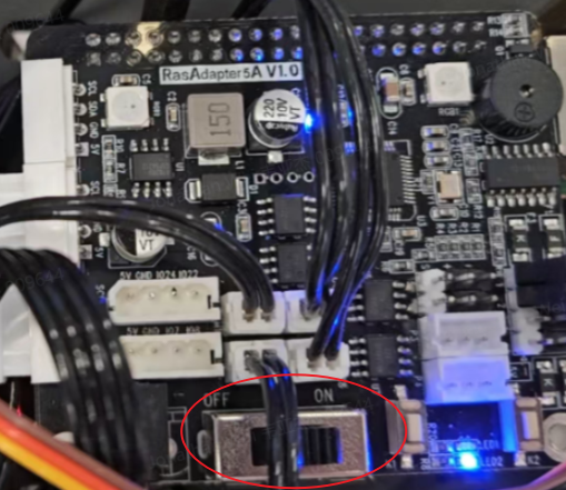 - 再将扩展板的开关由“OFF”推动到“ON”,此时扩展板的LED1、LED2常亮,稍等片刻后LED1由常亮变为每隔1秒闪亮一次、云台回到初始姿态、蜂鸣器发出“嘀”的一声,即设备成功开机。(大概需要等待30s后会听见“嘀”的一声)