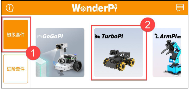 - 设备开机成功后,会进入AP直连模式,并生成一个以“HW”开头的热点。在手机上打开手机APP“WonderPi”,依次点击“初级套件”、“TurboPi”。