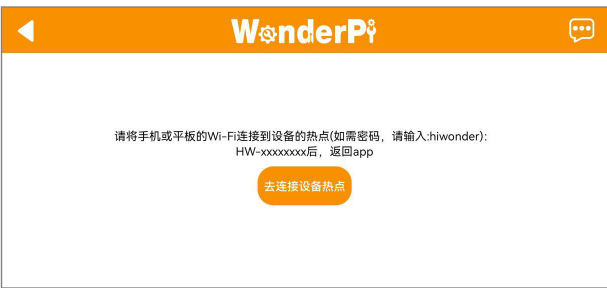- 点击“去连接设备热点”按键,前往设置界面,连接以“HW”开头的热点,连接时需输入密码“hiwonder”。