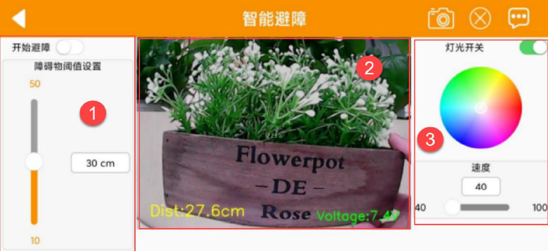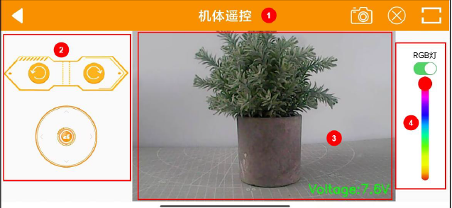 ③ 回传画面:显示摄像头的回传画面,并显示设备的电压值;