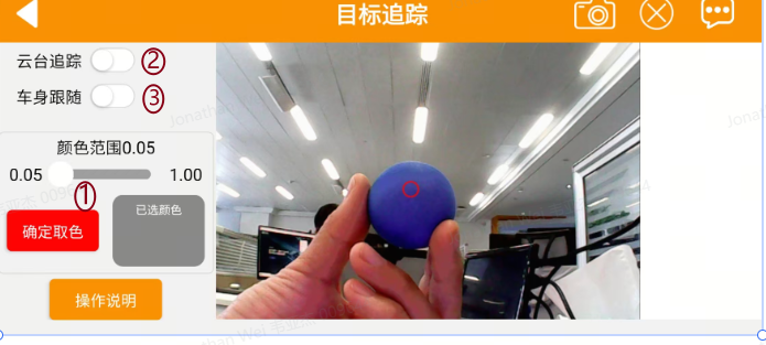- 点击②处“云台追踪”按钮,可启动追踪玩法,此时设备的摄像头将跟随选定的颜色目标运动,车体不动;