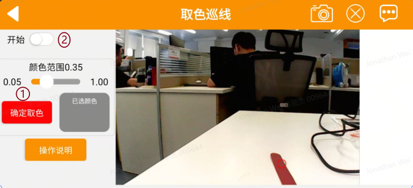 - 在以上画面中,点击①处按钮会从“取色”变为“确定取色”,在右边摄像头捕捉的画面中,挪动红色小圆点选中目标颜色,再点击“确定取色”确认颜色;