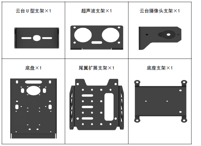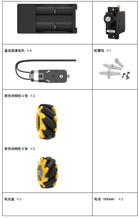 - 套件包含型材/电子/螺丝等结构件、18650电池盒、主控与扩展板、云台摄像头、工具配件等,详见下方实物参考。