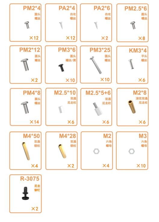 以下图片提供器材、电子元器件、螺丝与工具的实物参考,便于到货后快速核对与入料管理。