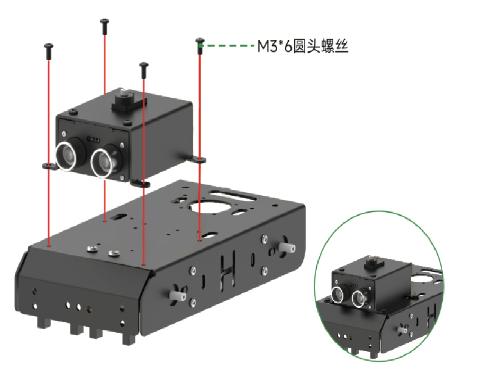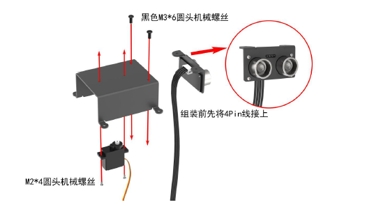 用2颗M2*4圆头机械螺丝,将PWM舵机装在底座支架上;用2颗黑色M3*6圆头机械螺丝,将组装好的超声波支架装在底座支架上(组装前先把4pin线装上)。