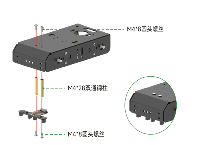 用4颗黑色M3*6圆头机械把组装好的底座支架安装在底盘上。