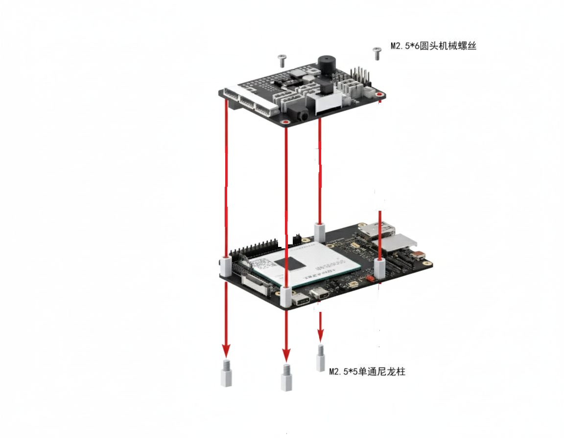 用3颗M2.5*5单通尼龙柱和3颗M2.5*10双通尼龙柱把主板固定好。并将扩展板的排母,对准主板的排针(一一对齐)插入主板中。然后用2颗M2.5*6圆头机械螺丝将扩展板和主板固定住。