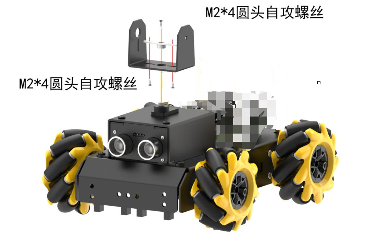 用2颗M2*4圆头自攻螺丝把塑料轴固定在云台U型支架上,接着用1颗M2*4圆头自攻螺丝把组装好的云台U型支架安装在小车上。