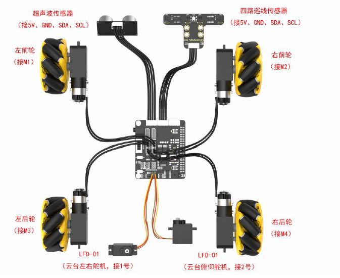 - 一体化智能视觉解决方案:集成高清云台摄像头、超声波、巡线传感器与多自由度底盘。