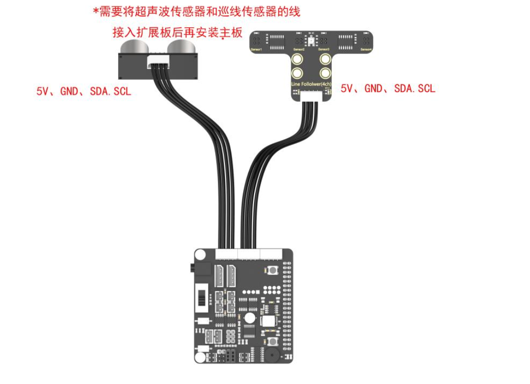 用4颗M2.5*6圆头机械螺丝把组装好的主板固定在底盘上,并将四路巡线传感器和发光超声波传感器接到扩展板对应接口上。