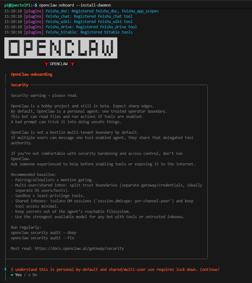 首次安装完成后,必须完成配置向导流程,否则 OpenClaw 无法正常运行。执行以下命令启动配置向导,并安装网关守护进程:
