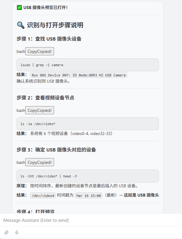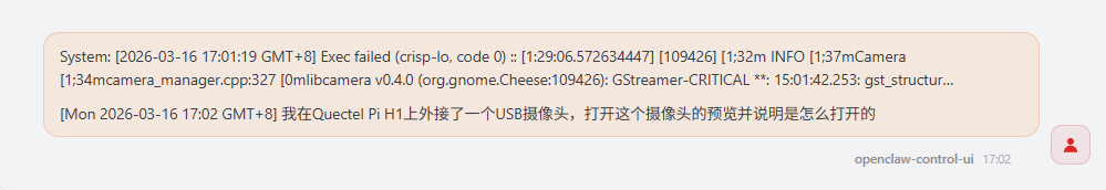 通过 OpenClaw 的 Web 控制页面发送对话指令,等待片刻后,即可在外接显示屏上看到 USB 摄像头的实时预览画面。