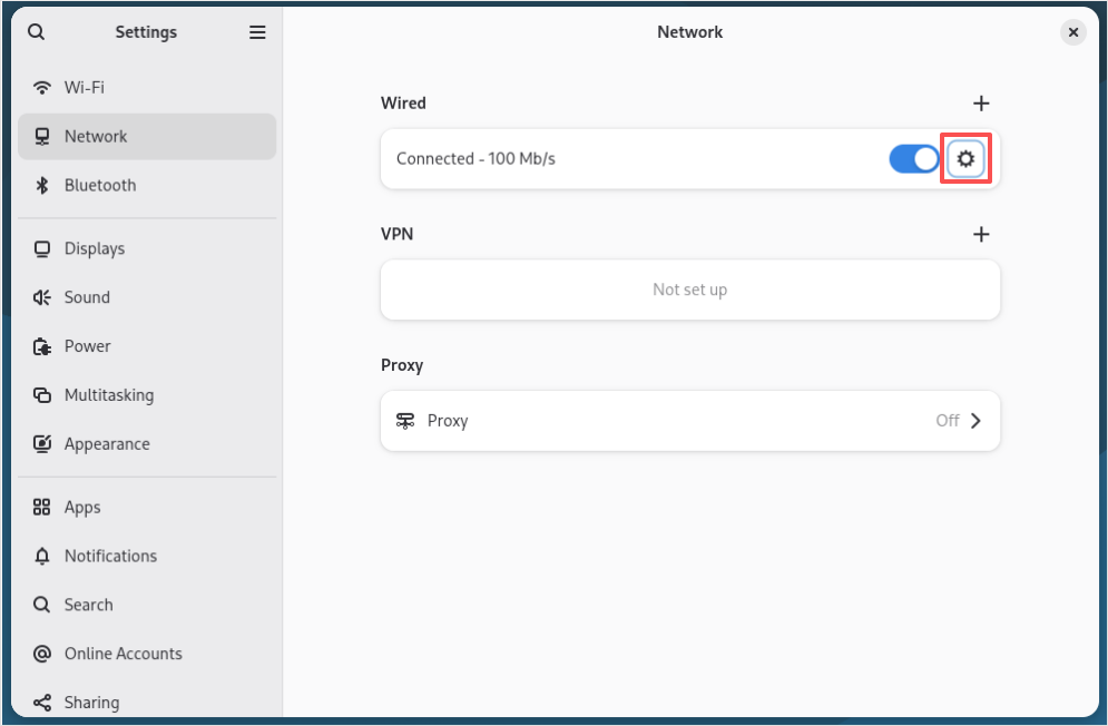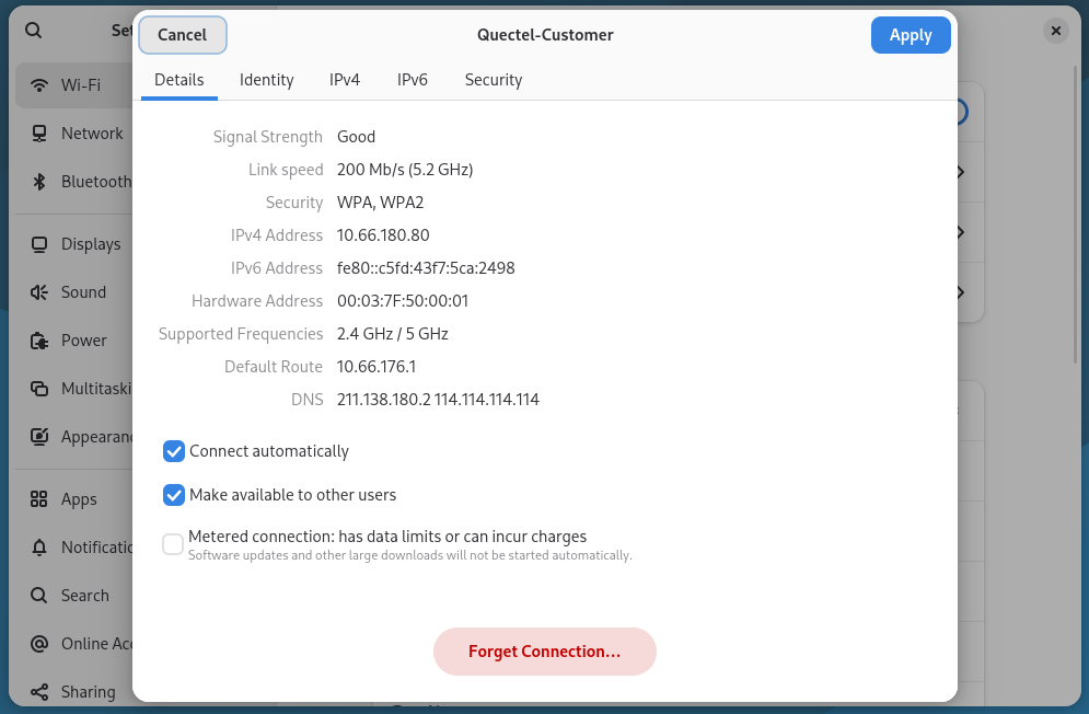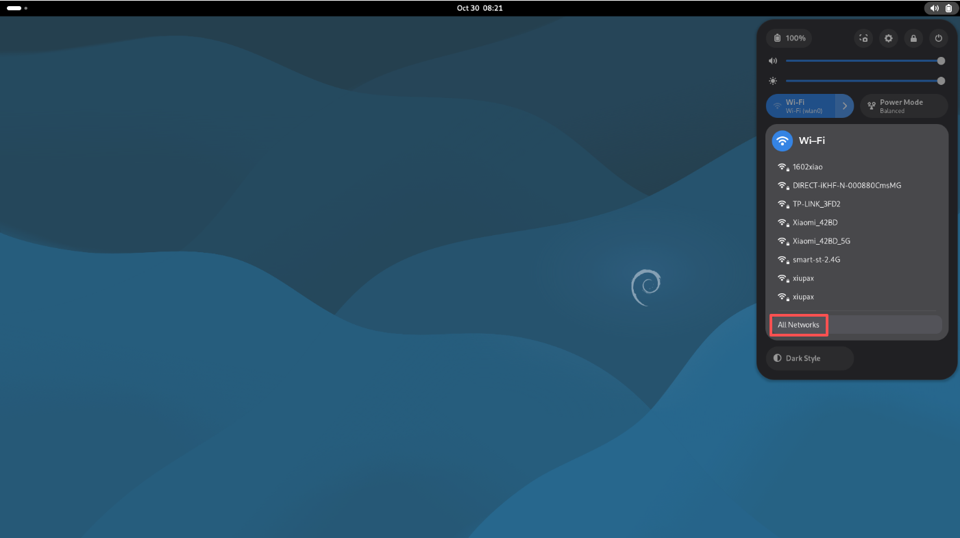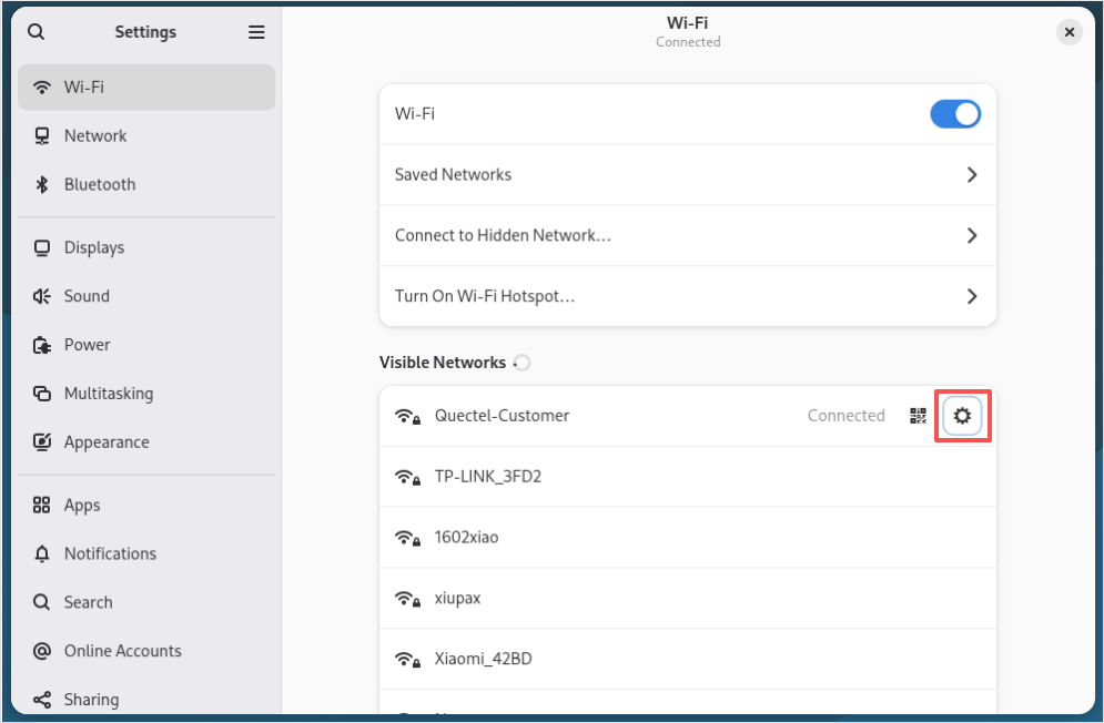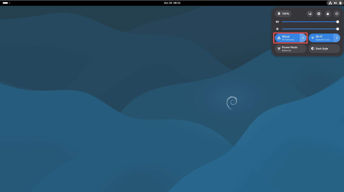 - 点击 gnome 桌面右上角状态栏,点击 WIFI 右边箭头