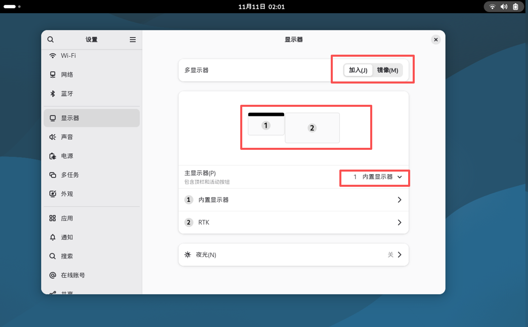 连接好硬件后,系统会自动识别两个显示屏设备。默认情况下: