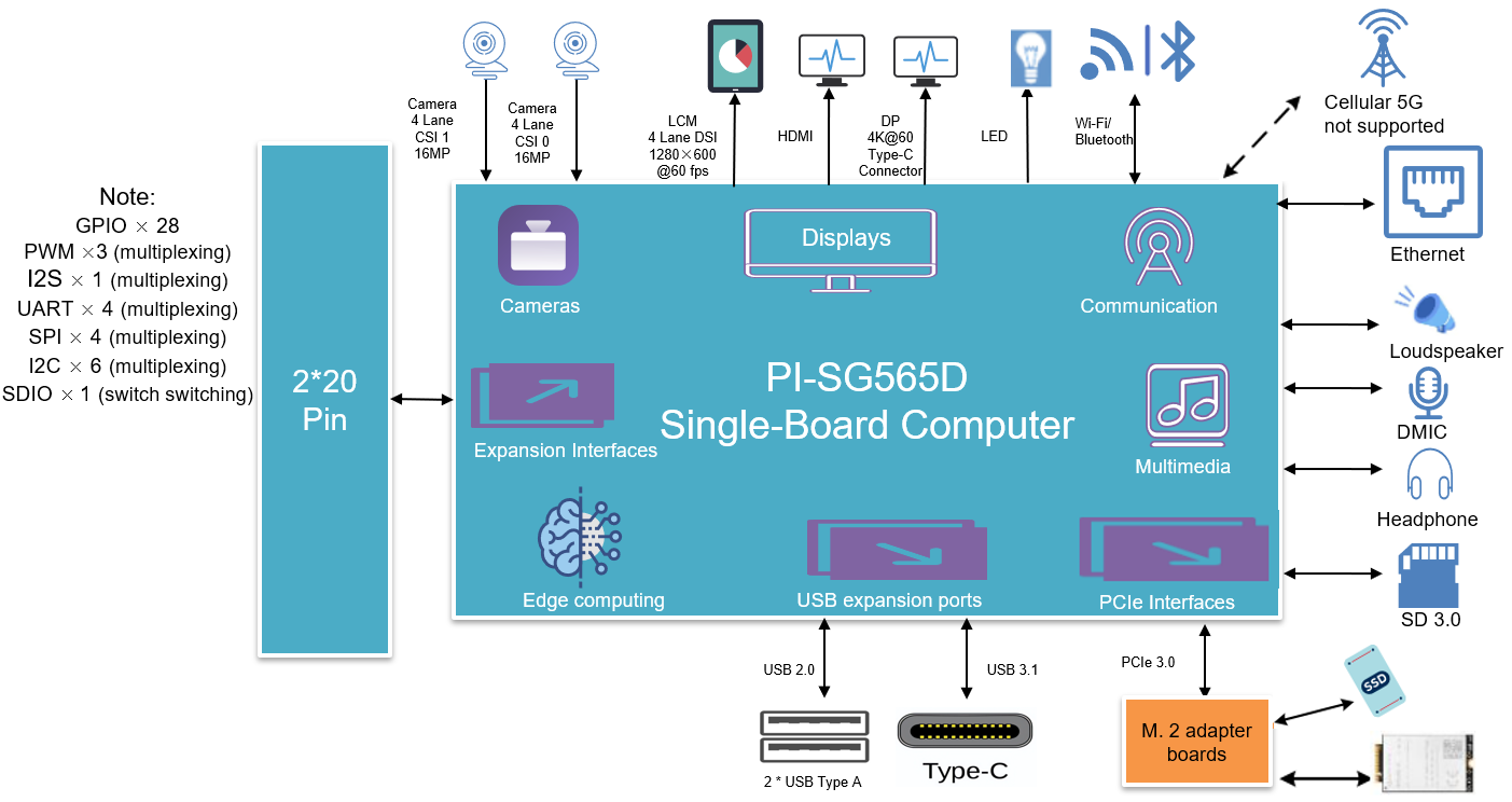 | 20 | 2 × 20 Pin 排针 | 多种复用功能的 GPIO,可复用为I2C、SPI、PWM 等 |