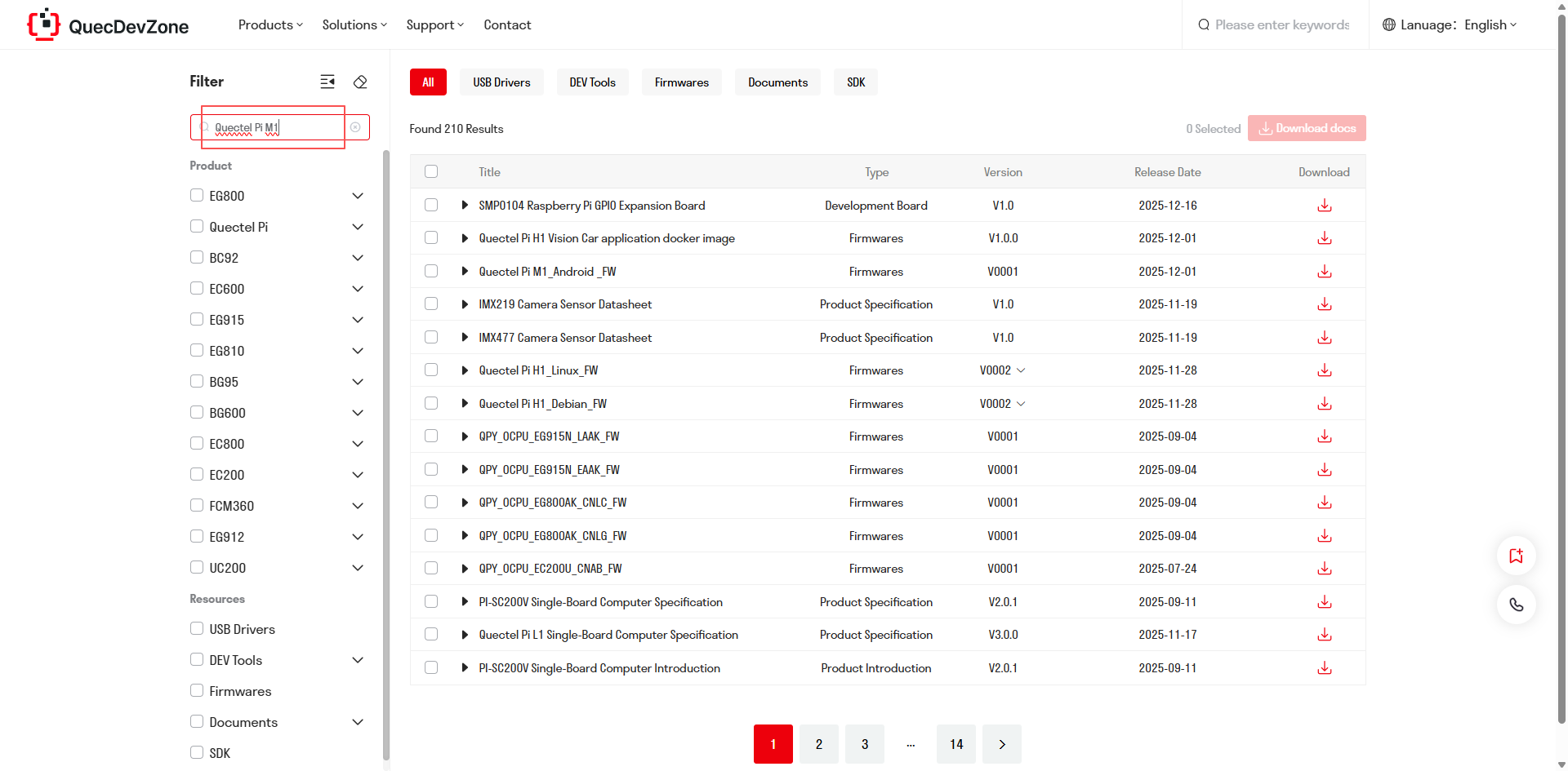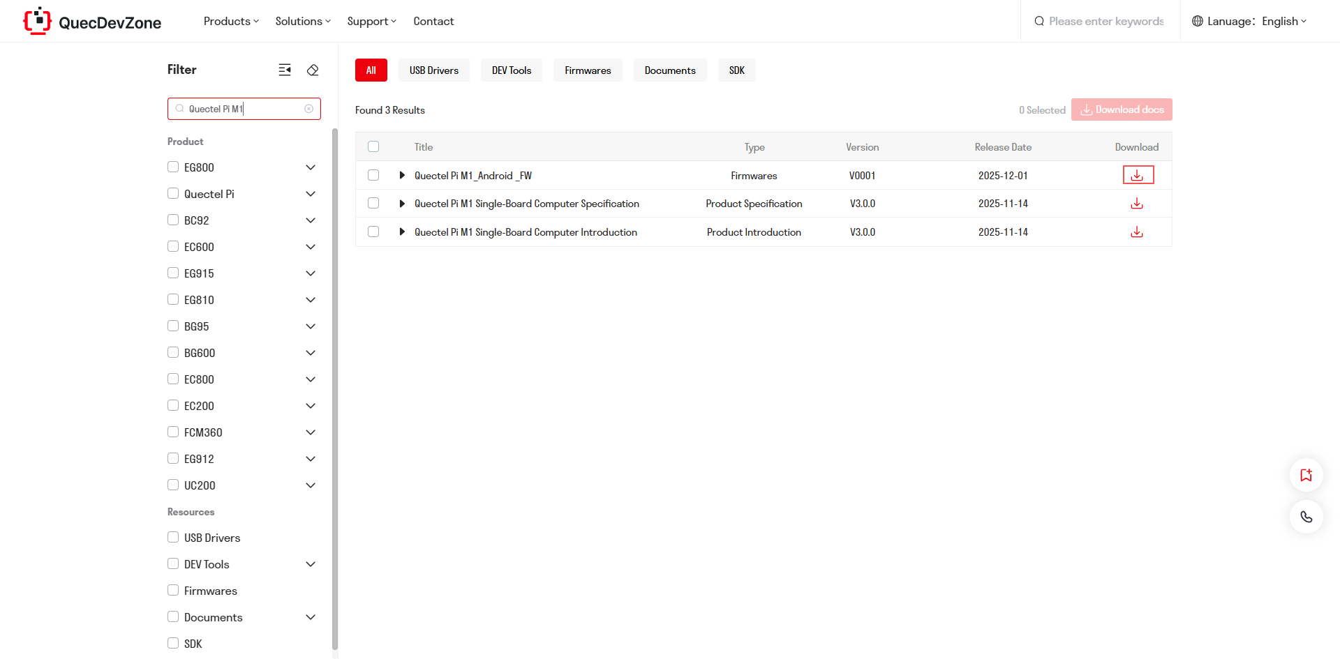 The Android image for the Quectel Pi M1 smart single-board computer can be obtained from the Quectel Developer Website. You can click "Support" → "Firmware" on the top navigation bar and search for "Quectel Pi M1" to find and download it.