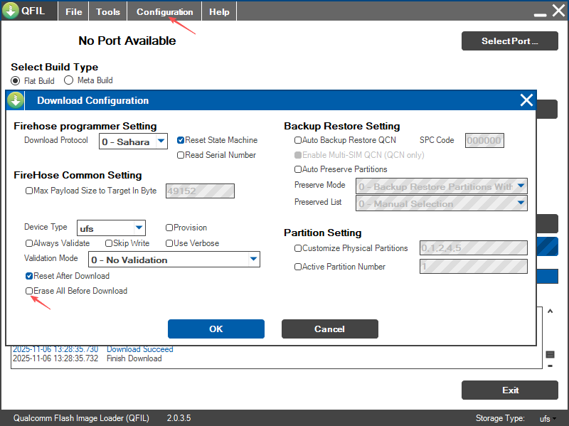 - Please note that the "Erase All Before Download" option in the configuration cannot be ticked.