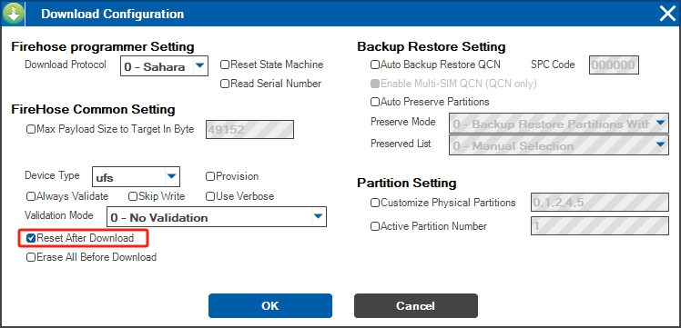 - Click on the "Configuration" button, click on "FireHose Configuration" button that pops up, select the "Reset After Download" option box, and click the "OK" button.