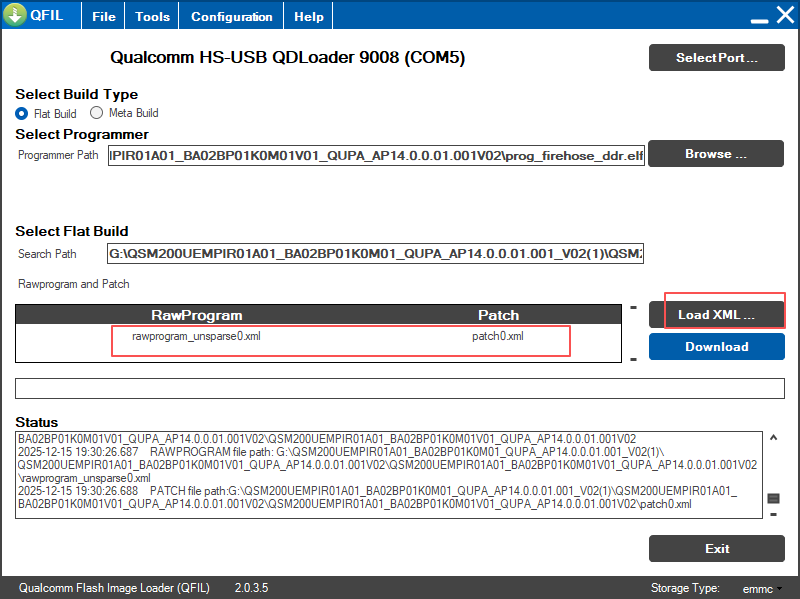 - Click the "LoadXML" button and select all "rawprogram0.xml" and "patch0.xml" files.