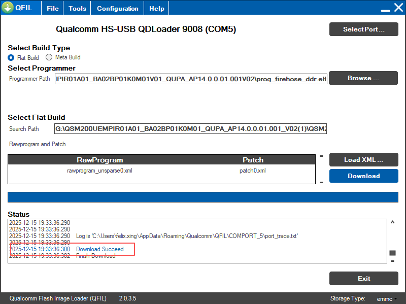 QDL_Win_x64>QDL.exe prog_firehose_ddr.elf rawprogram_unsparse0.xml patch0.xml