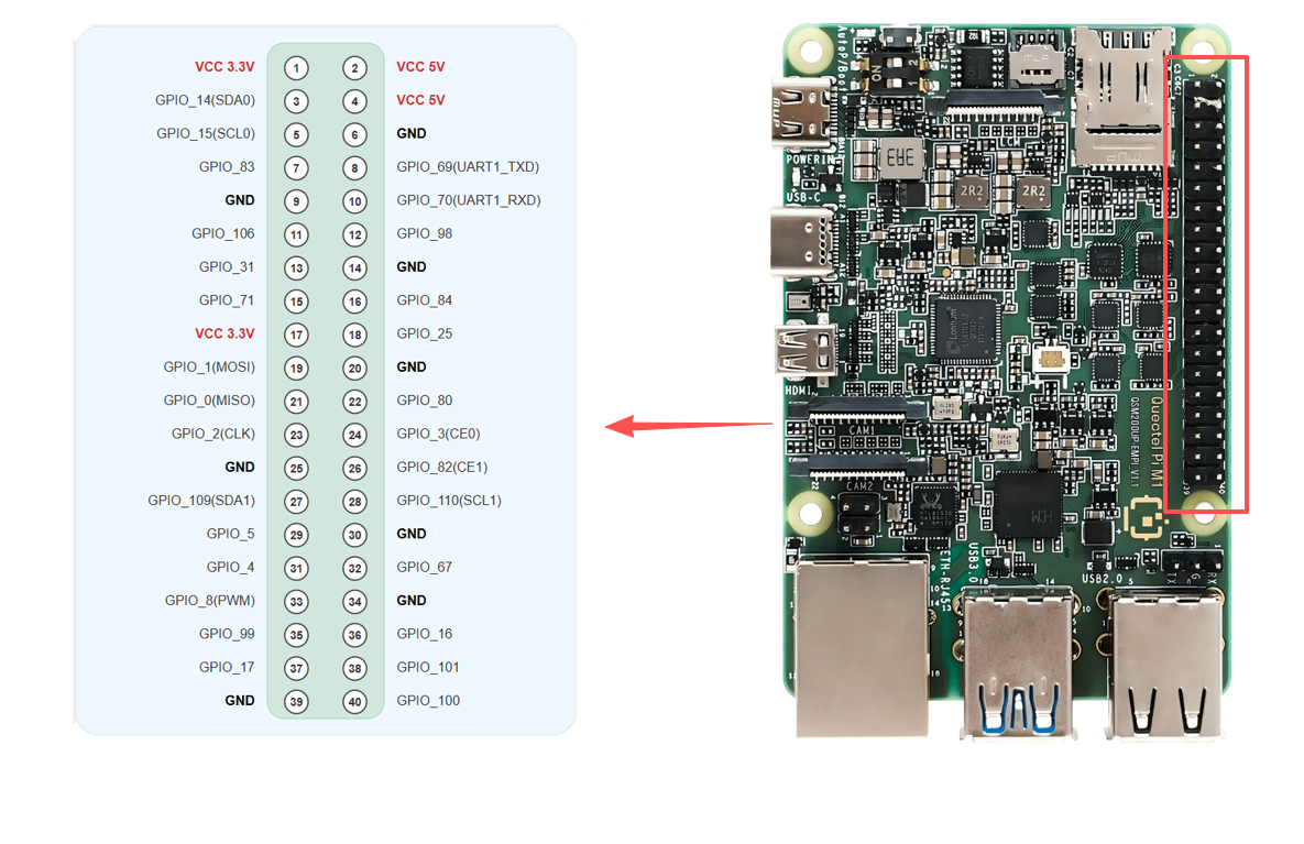 Quectel Pi M1 smart single-board computer provides a standard 40‑pin GPIO expansion header, supporting multiple peripheral interfaces such as GPIO, I2C, SPI, UART and PWM. This chapter describes how to test these interfaces.
