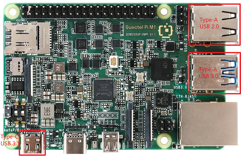 The Quectel Pi M1 smart single-board computer features two standard USB 3.0 Type-A ports, two standard USB 2.0 Type-A ports, and two USB 3.1 Type-C ports. The USB 2.0 ports offer a maximum data transfer rate of 480 Mbps, while the USB 3.1 ports offer a maximum data transfer rate of 5 Gbps.