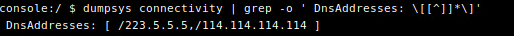 dumpsys connectivity | grep -o ' DnsAddresses: \[[^]]*\]'