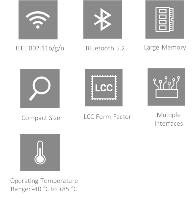 - Wi-Fi 4 模块,单频段(2.4 GHz)Wi-Fi,1 × 1 天线