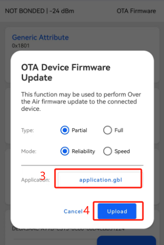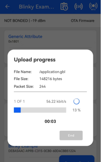 - Open the EFR Connect APP on your mobile phone and start scanning. Once the Blinky Example appears, click "CONNECT" to establish a connection. Then click "OTA Firmware" to perform the OTA upgrade. When the "OTA Device Firmware Update" interface is displayed, select "application.gbl" in "Application" text box and click "Upload".